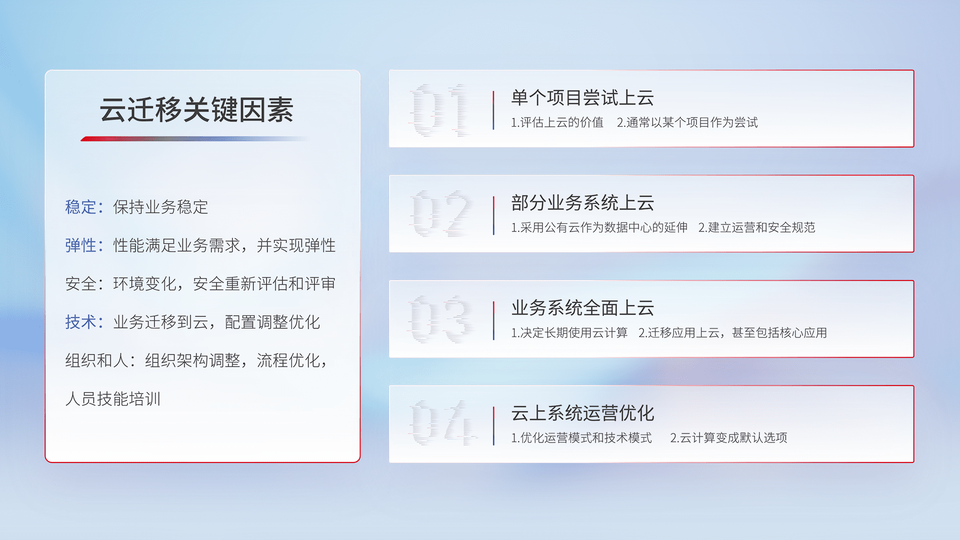 结合实际业务,,,从规划设计、、、云平台选型、、、、云原生改造、、、、数据迁移、、、、集成交付,,,,迁移全过程为客户识别最佳上云路径,,做好风险识别管理,,,,设计网络架构、、、、身份权限、、、安全审计合规、、、、操作审计、、日志审计、、、、监控告警策略、、多站点容灾设计等,,对云上基础设施进行整体规划,,,提升IT治理水平,,,以满足弹性、、、、高可用、、、高性能的需求。。。