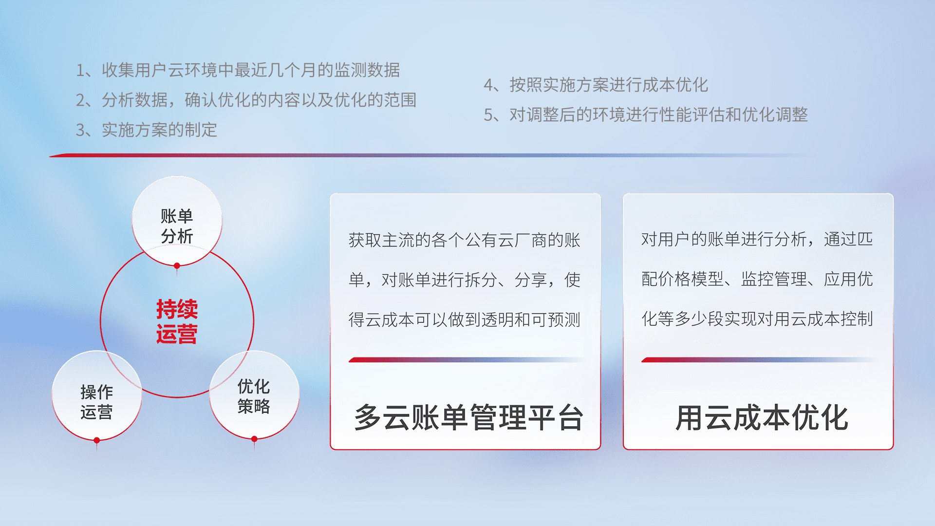 通过多云纳管,,,,以统一的资源数据模型把客户的云资源进行抽象和封装,,,,进而实现对多云资源的统一操作,,,保障云资源管理的可靠性、、稳定性与可用性。。。量身定制化运维内容,,,配置、、、、开发运维、、补丁管理、、、备份、、、、监控、、、、认证和访问管理、、、审计和日常巡检等,,,保障在用云过程中的可靠度,,,,稳定度以及高可用率。。。。